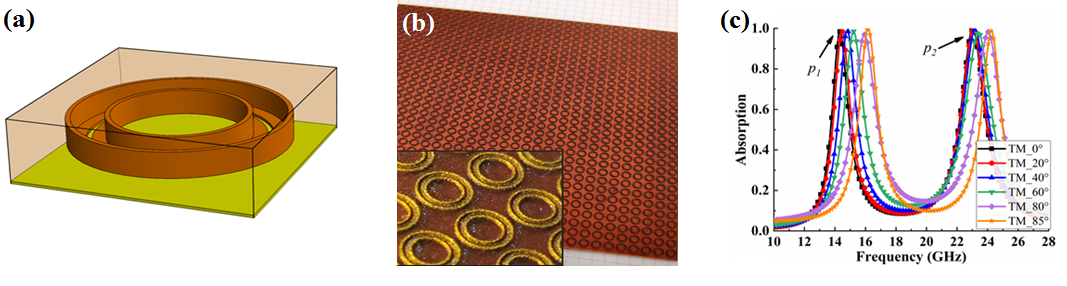 图2 (a)具有双侧壁的闭环谐振结构超材料及其(b)样品制备和(c)吸收频谱