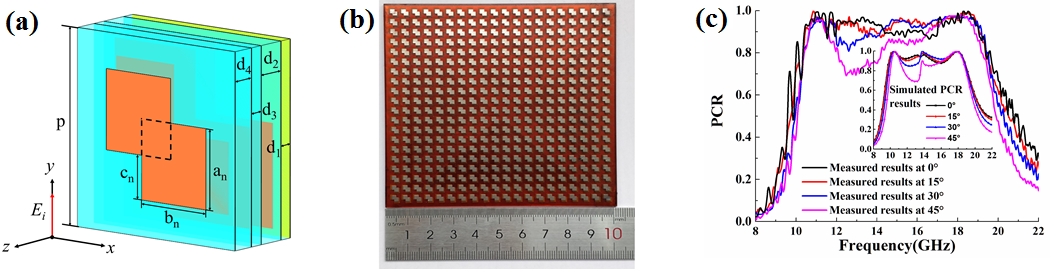 团队设计了一种基于多层结构超材料的极化变换器,在每一层引入不对称的金属谐振单元,通过合理设计不同谐振单元层的拓扑结构,在9.8-18.9 GHz的频带范围内实现了入射/透射波的极化变换功能。相关成果发表于J. Appl. Phys., 2020, 127 (9): 093103,并被选为编辑精选文章(Editor’s pick)。同时,团队通过在闭环谐振结构中引入立体侧壁,实现了三维超材料对宽角入射电磁波的高效吸收,分析表明入射电磁波在侧壁产生的环路电流是增大宽角吸收率的主要原因。相关成果发表于Appl. Phys. Express, 2021, 14: 022005。此外,设计了一种具有三维谐振环交叉结构的超材料,利用相互耦合的立体谐振环,在Ka频段内实现多频电磁波的完美吸收。该研究同样证实了三维谐振超材料对超宽角入射电磁波也具有优异的吸收效果。相关研究工作已发表于Phys. Status Solidi A., 2021, 218: 202000734,并被选为封面文章(Cover article)。